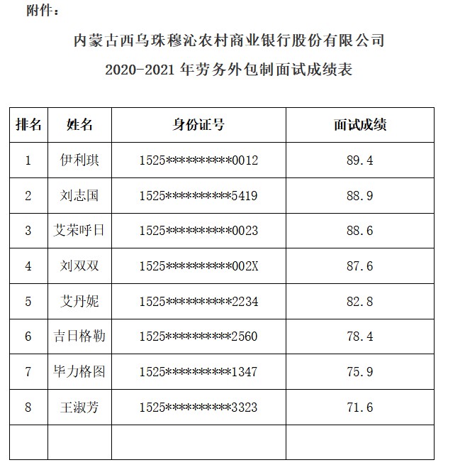 內(nèi)蒙古西烏珠穆沁農(nóng)村商業(yè)銀行股份有限公司 2020-2021年勞務(wù)外包制面試成績(jī)公示新聞動(dòng)態(tài)當(dāng)前位置